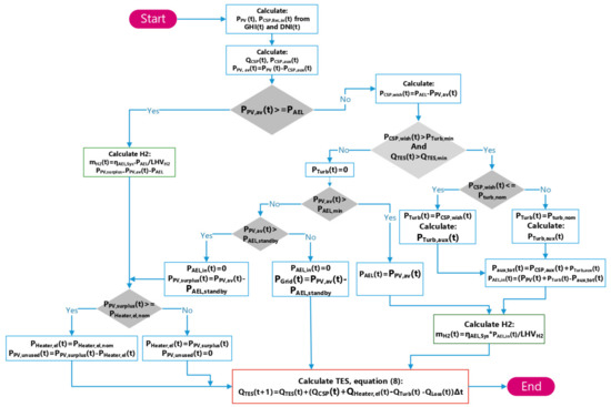 Operational strategy for time step calculation of PV/CSP hybrid hydrogen production plant.
