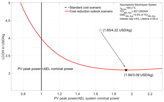 Levelized cost of hydrogen (LCOH) depending on the PV peak power to AEL nominal power ratio for the location Ouarzazate in Morocco. The study was performed for the standard cost scenario and the cost reduction outlook scenario.