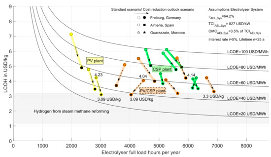 Figure 8 presents the results of the hydrogen production plant design optimization for an alkaline electrolyser system powered solely by PV, solely by CSP or by a combined PV/CSP hybrid power plant. The plotted points are the Levelized Cost of Hydrogen (LCOH) and the corresponding full load hours per year of the electrolyser plant determined with the energy system model of this work. The shown reference lines are determined with Equation (23), a correlation that determines the LCOH (USD/kg) from the investment annuity and operating costs depending on the full load hours of the electrolyser and the cost of electricity. This correlation was adapted from [10] and same assumptions for TIC and OMC were used like in the overall plant model: