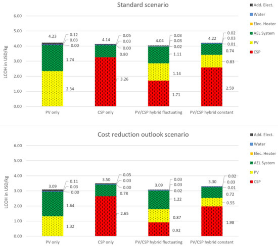 4.1.2. PV/CSP-Hybrid-AEL Plant and Overall LCOH Results