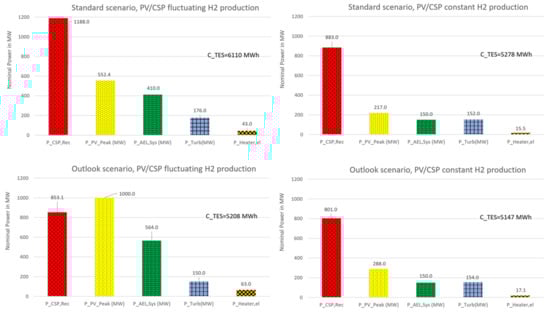 Optimized plant design of PV/CSP-hybrid alkaline electrolyser plants (fluctuating or constant hydrogen production) for the two cost scenarios and the location Ouarzazate, Morocco. Nominal power of process equipment is provided.