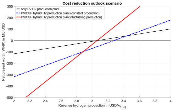 Net present worth (WNP) of the best solar hydrogen production plants depending on the revenue of the produced hydrogen (cost reduction outlook scenario).