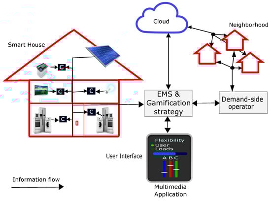 Gamification strategies allow people to change their consumption and social involvement through incentives, environmental awareness, and possible competition and cooperation with other community members in similar conditions []. Gamification techniques applied to EMS make it possible to stimulate users to diminish their energy consumption and save money on billing [], which entails reducing greenhouse gas emissions produced by the primary electricity grid. In addition, these techniques may favor renewable energies and allow for exchange of information in real-time between suppliers and consumers for energy resilience and security. They provide valuable tools for the energy market to better distributor system operators (DSOs) and demand response (DR) programs while creating or increasing the community’s sense of belonging [].