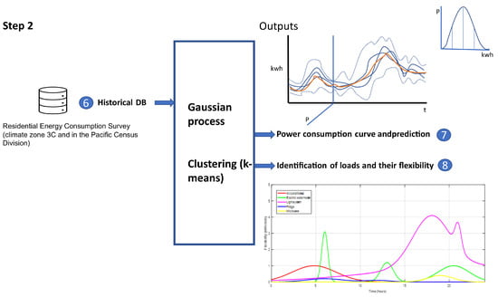 Figure 5. Diagram of Step 2.First, fit a Gaussian process (GP) regression model training the data to predict the energy consumption and quantify the uncertainty in the model. A Gaussian process is a probability distribution over random functions or infinite collection of variables (functions) such that any subset of finite random variables has a multivariate Gaussian distribution []. The Gaussian process provided a predictive posterior distribution of the output with full information of the prediction, including its confidence level and predicted mean []. Then, GP allows correlating the energy consumption as the dependent variable (output) with other known, measured independent parameters (inputs), as the time of the day and weather.Let the consumption data function be a vector X in ℜ, as the domain h has m elements, the has the probability density for each h function and makes a correspondence between the function and its vector , , then:where and are the covariances and means of the variables in the process, or the hyperparameters to be determined in a gradient-based process (non-convex optimization problem).For the Kernel function, squared exponential was used:where and has high covariance when x and are closed in input space and low covariance when they are separated in the input space.For this experiment, consumption patterns were obtained from California Energy Consumption databases [] and the characterization of the power consumption and the uncertainty of user behavior follows Gaussian distribution [], obtained from consumption patterns in a lapse time of a household, or consumption patterns of different households with certain similarities if the community consumption is desired. In this way, an energy consumption curve is calculated in order to predict consumption under certain conditions. - Step 3. Decision-making process. Statistical analysis is made using Gaussian distributions based on consumption databases to calculate the expected consumption (see Figure 6). Considering the defined characteristics of the loads and the house’s consumption curve, the load flexibility identification is analyzed and determined. Loads are classified into flexible and non-flexible according to consumption patterns and load features, as described in [,].