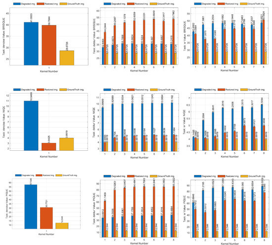 The assessment of image quality and the evaluation of the results of the presented polymodal method in comparison with the degraded images was conducted on the basis of four different image quality metrics (IQM): blind referenceless image spatial quality evaluator (BRISQUE) [71], natural image quality evaluator (NIQE) [72], perception-based image quality evaluator (PIQE) [73] and peak-signal-to-noise ratio (PSNR) [74]. Chosen no-reference image quality scores generally return a nonnegative scalar. The BRISQUE score is in the range from 0 to 100. Lower score values better reflect the perceptive qualities of images. The NIQE model is trained on a database of pristine images and can measure the quality of images with arbitrary distortion. NIQE is opinion-unaware and does not use subjective quality scores. The trade-off is that the NIQE score of an image might not correlate as well as the BRISQUE score with human perceptions of quality. Lower score values better reflect the perceptive quality of images with respect to the input model. The PIQE score is the no-reference image quality score, and it is inversely correlated with the perceptual quality of an image. A low score value indicates high perceptive quality, and a high score value indicates low perceptive quality. A higher PSNR value provides a higher image quality, and at the other end of the scale, a small value of the PSNR provides high numerical differences between images. Figure 8 presents the calculated results of the aforementioned image quality evaluators in graphical form.