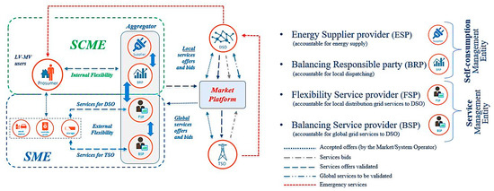 The entities who deal with the increase of community self-consumption (ESP and BRP) represent the Self-consumption Management Entity (SCME), while the management of the flexibility services is delegated to the Service Management Entity (SME), composed of BSP and FSP.