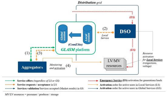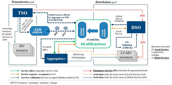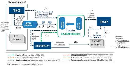 When active users are available for flexibility in a specific time interval, the aggregator places the offer in GLASM without knowing whether the offer will be accepted by DSOs or TSOs, since the matching between offers and bids is based on the system operators needs and priority. On the basis of the first market session (local session), it is checked whether DSOs require flexibility; if not, a second market session (global session) checks whether the flexibility offer matches with a TSO request on ASM as reported in the following Figure 5 that highlights the entire sequence of the operations in the case local services are not required by the DSO in the local session.