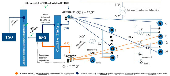 Additionally, for local services, the aggregator distributes the power request among the aggregated resources through the distribution coefficient (αi). As an example, the offer for local services in Figure 7 (Off.2) is given by the total aggregated capacity to be activated (P*, Q*). The aggregator, always considering the information it receives in real time from the managed resources, separates the overall request in several smaller orders to be sent to the available resources located within the network section where the service is required.