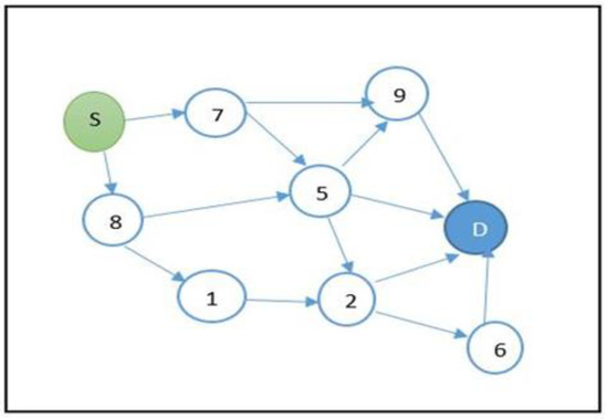 The evaluation function is calculated by utilizing Euclidean distance. The more the value approaches zero, the better the solution. If the possible paths established are S-7-9-D, S-8-1-2-D and S-5-D, therefore