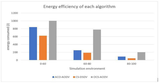 Figure 5 denotes the comparison of the network lifespan for the three routing protocols, namely OCS-AODV, CS-DSDV, and ACO-AODV, under various environmental conditions, namely 0 to 60, 60–80, and 80–100 internals. When nodes are in an idle state, they switch to a sleep mode to save battery. We observed that, compared to other routing protocols, the proposed scheme was the best performing scheme. The advantage of the proposed scheme is that it utilizes the cluster-heads, optimization strategies, and improved data-transmission techniques to conserve energy of the nodes. The graph shows the performance of the three routing protocols during the simulation. The time ranges are divided into three categories reflecting observation of the mobile nodes on how long they could operate before they could ran out of power. It shows that the proposed scheme consumes the least power compared to the other routing protocols.