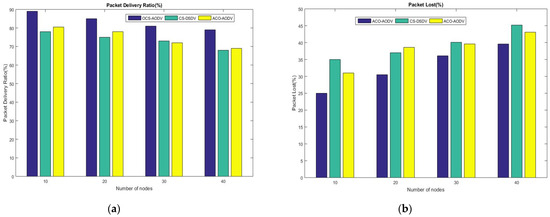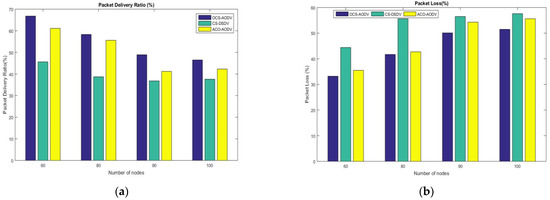 Figure 7 depicts the simulation results that demonstrate that OCS-AODV is the best performing protocol due to lower rates of packet loss and higher PDR. CS-DSDV is marginally better, which means that it would perform better if the route-discovery challenge can be addressed to enable the delivery of more packets. We also observed that, as the mobile nodes increased in CS-DSDV, the scheme experienced many delays that affected the delivery of transmitted packets. The challenge of the ACO-AODV is the process of discovering paths. When a link is broken, the scheme is not efficient enough to handle a congested environment, as illustrated in Figure 7a.