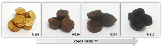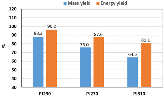 Table 1 shows the average gravimetric yield of the torrefied products (PJ230, PJ270, and PJ310). These results are in agreement with the literature [20,31], which reports that the mass yield of a solid product strongly depends on the torrefaction temperature, the reaction time, and the type of biomass.