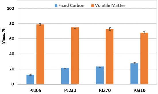 Profiles of the volatile matter and fixed carbon of P. juliflora samples.