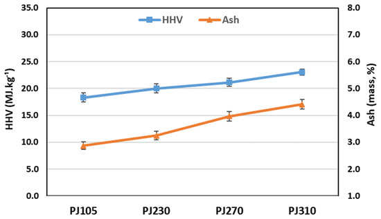 Figure 4 shows the profiles with the higher heating value (HHV) and ash from the samples torrefied at different temperatures. The HHV for PJ105, PJ230, PJ270, and PJ310 were 18.33, 20.01, 21.14, and 23.05 MJ/kg, respectively.