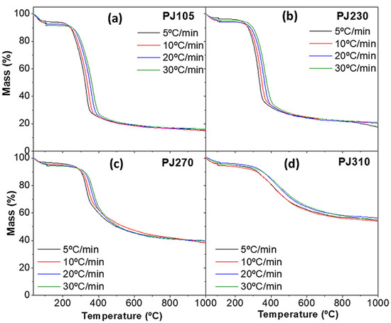 The pyrolysis of samples PJ105, PJ230, PJ270, and PJ310 was investigated using TG curves obtained in a nitrogen flow and heating rates of 5, 10, 20, and 30 °C/min, as shown in Figure 6. The range of mass loss attributed to residual moisture and adsorbed gases was 100–120 °C, being more related to PJ105. In general, for the samples, the thermal devolatilization stage started around 180–200 °C, followed by a great loss of mass around 200–640 °C, and by a flat flow zone that depends on the torrefaction temperature used (230, 270, or 310 °C). The thermal devolatilization events of hemicellulose, cellulose and lignin are often observed between 220–315 °C, 315–400 °C, and 180–850 °C [23,27], respectively, but some variations can occur between the different types of biomass.