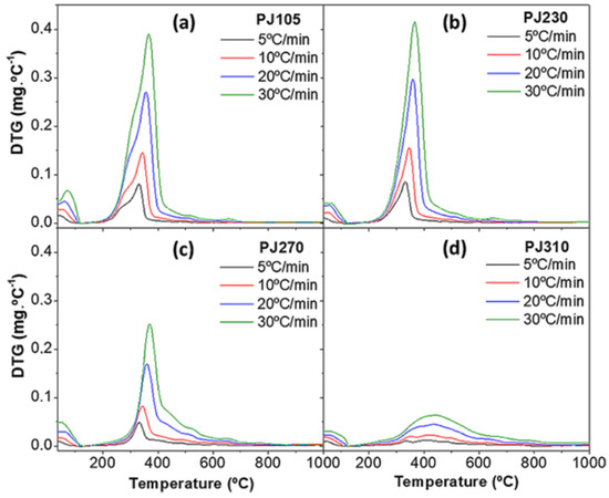 The loss of mass due to devolatilization is shown in the derivative profile by the shoulder- and peak-shaped curves, corresponding to the decomposition of hemicellulose and cellulose, and then another small deformation at high temperature related to lignin is reported in the literature [61,63]. The gradual disappearance of the shoulders, respectively in samples PJ230, PJ270, and PJ310, occurring in the range of 220–320 °C, is an indication of possible degradation of holocellulose and other components as the pre-treatment temperature increases [33,63]. The smoothing of the curves was observed by Cao, Yuan, Jiang, Li, Xiao, Huang, Chen, Zeng, and Li [5].