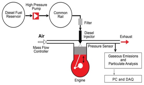 The eddy current dynamometer was coupled with the engine setup for applying load. A separate control system monitored the load. The test fuels D100, B25 and B50 were used to test all the properties by maintaining a constant engine speed and compression ratio. A series of sensors were used to measure the air consumption rate and the orifice plate pressure. The location of the crank angle encoder was the opposite side of the eddy current dynamometer. The data acquisition system was equipped to measure fuel consumption with a burette-based optical sensor [30,31,32,33]. The combustion parameters, engine performance and combustion performance were calculated by keeping the engine at full load.