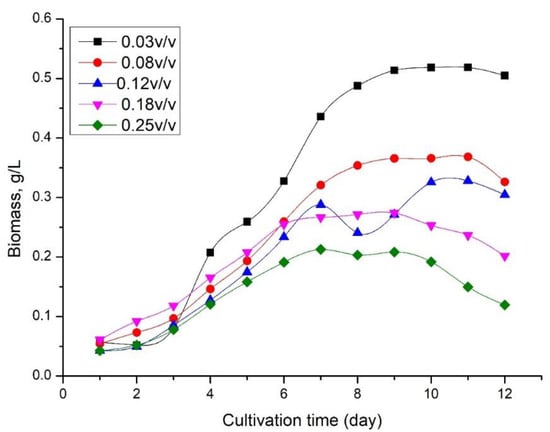 The cultivation of Spirulina in wastewater showed that the efficient time of cultivation must be lower than six days (Figure 2) due to the decreasing concentration of nutrients. As the concentration of the wastewater increased from 0.03 v/v to 0.25 v/v, the biomass concentration decreased by 90%, which confirmed that Spirulina competed for the nutrients with other microorganisms in unsterilized wastewater, and the highest dilution is necessary for the successful growth of Spirulina.