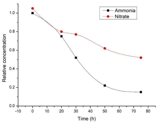 Ammonium and nitrate concentrations in the wastewater were sufficiently removed during the Spirulina cultivation (Figure 3). Original ammonia and nitrate concentrations decreased from 0.75 and 0.8 to 0.15 and 0.52, respectively, after 75 h. The decrease of ammonia to half of its original concentration was recorded within 40 h of cultivation, and nitrate concentration decreased by the same amount in 75 h (Figure 3).