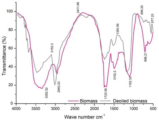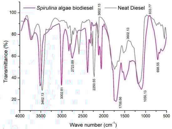 FTIR analyses of Spirulina biomass, de-oiled biomass, Algae blends, and neat diesel were performed (Figure 4 and Figure 5). The peaks from 3100 cm−1 to 2800 cm−1 denote the presence of lipids [39]. Due to the formation of high concentration lipids, the quality of the bio-oil was impacted, with reduced calorific value. Notably, peaks of 2943.23 and 1723.56 cm−1 were responsible for the stretching of -CH2- groups [40,41]. The drop in the peaks clearly emphasize the exaction of the lipid content from the biomass. The highest peak of 3462.13 cm−1 and the lowest peak of 1050.13 cm−1 were observed for the Spirulina blends and neat diesel due to the stretching of the double bond and C-O bond. The peaks in the algae were different from neat biodiesel (Figure 5) due to the presence of aliphatic hydrocarbon content in the neat diesel.