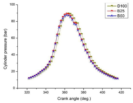 Cylinder pressure directly affects exhaust gas emissions. The variation in cylinder pressure for different crank angles at the compression ratio of 17.5:1 for the D100, B25 and B50 fuels is shown in Figure 6. Biodiesel made of Spirulina and enriched with CNT showed characteristics similar to D100 at the crank angle of 369.9. Moreover, the cylinder pressure was 88.0 MPa, and for the blends B25 and B50 the cylinder pressure was 863 kPa and 855 kPa, respectively, under the same conditions. The cylinder pressure was lower in the CNT B25 blend; however, NOx emissions were higher. The rate of combustion depends mainly on the cylinder pressure. The type of fuel used also plays a significant role. The cylinder pressure variation for different fuel blends of Spirulina and CNTs as well as plain diesel fuel is shown in Figure 6. Cylinder pressure was consistently high for plain diesel D100, which was 2% higher than B25 and 5.4% higher than B50.