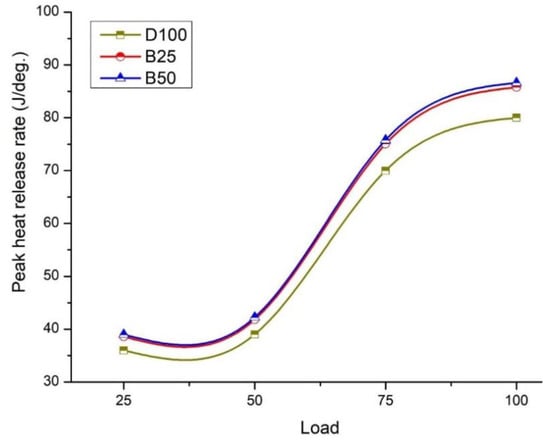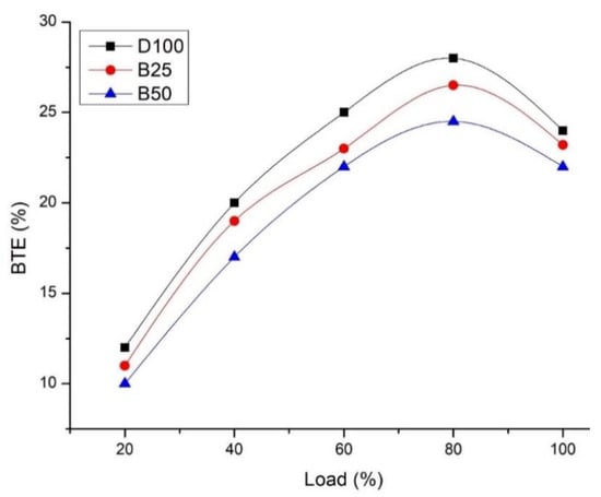 The factors affecting the BTE are the volatility, viscosity, density, and heating value of fuel. BTE is reduced due to a decrease in the calorific value of fuel. The calorific value of B25 and B50 was low due to the additional consumption of fuel. The brake thermal efficiency of B50 was lower than the BTE of B25. The BTE values of D100, B25, and B50 were 28%, 26.5%, and 32.1%, respectively, at 80% load condition of the engine [56]. At full load, there was a drastic drop in BTE (Figure 11). The total reduction in BTE of B50 was 5.3% when compared to B25.