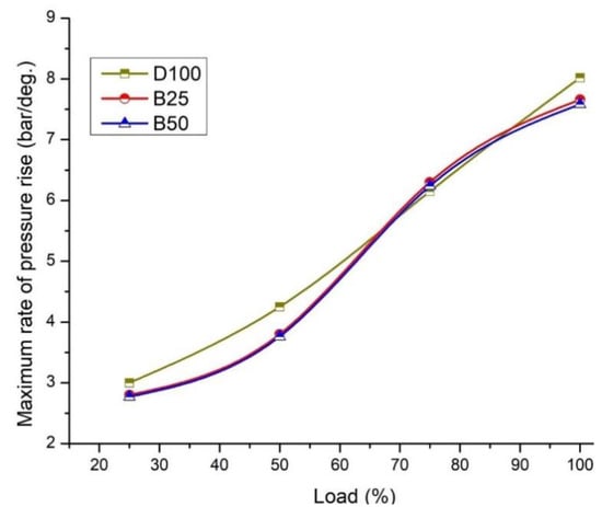 The measurement of pressure rise (MRPR) with different loads of 25%, 50%, 75%, and 100% for neat diesel and CNT-mixed B25 and B50 revealed peak pressure that was observed near the top dead center and that increased the power output (Figure 8) [42,43]. The determination of MRPR is crucial since it is one of the main reasons for NOx emissions and the cause of knocking. The peak pressure values were 8.09, 7.55, and 7.5 for D100, B25, and B50, respectively [44,45,46]. At 100% load, the rate of MRPR was 2.8% higher in D100 fuel than the B50 fuel blend at the compression ratio of 17.5. The lower rates of MRPR for D100 and B50 were 3.15 bar/deg and 2.4 bar/deg. Considering the knocking effect, the peak pressure level was above 0.8 MPa. The permissible level of pressure is from 6 to 7 bar [47,48]. When comparing the results, dispersion of CNT with the conventional diesel improved the compression ratio. Further, the blends with CNT had better anti-knocking quality than other fuel blends.