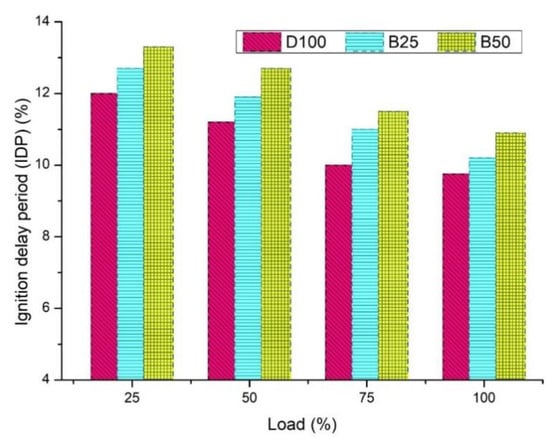 Ignition delay refers to the time gap between the time of injection of the fuel and its ignition, and it rises with the amount of injected fuel. Higher ignition delay leads to higher NOx emissions, higher heat release rate due to over consumption of fuel, and higher air–fuel mixing rate. The ignition delay for D100 was lower than for B25 and B50 (Figure 9). The ignition delay for D100 was 12.02º, and it was 12.65º for the fuel blends of CNT, pre biodiesel, B25 and B50, which is lower due to a CR of 17.5 [49,50,51,52,53]. Emissions are reduced by maintaining the pressure and temperature, resulting in the stable operation of the engine.