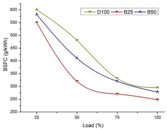Density and viscosity of the fuel are the influencing factors for specific fuel consumption. The calculated SFC [54] of B25 was the lowest (Figure 10). On the other hand, the fuel consumption rate of other blends was higher due to the deficit in the heating release rate. Initially, at 25% engine load, the BSFC was 599 g/kWh, 556.3 g/kWh and 576.4 g/kWh for D100, B25 and B50, respectively. Surprisingly, the performance value of B25 was 8.6% higher than D100. On the other hand, at full load conditions, the respective BSFC values were 295 g/kWh, 248 g/kWh, and 278 g/kWh. Typically, this is 17.3% and 59% lower than neat diesel [55].