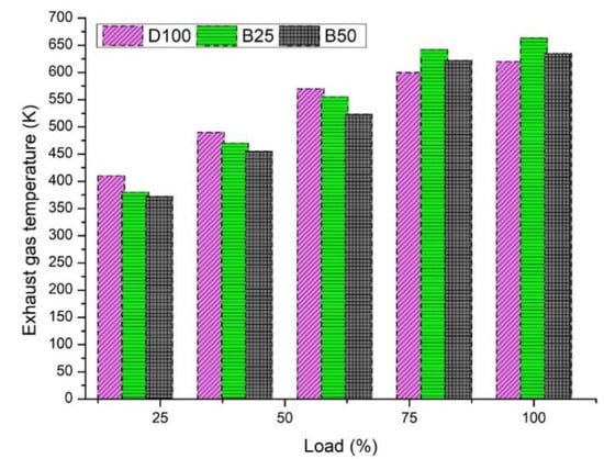 With a higher amount of fuel injected into the engine, the engine’s temperature increases, which consequently increases EGT. The combustion process timing also affects the EGT [57]. However, due to the lower calorific value and higher oxygen content present in the biodiesel blends, the EGT value is lower than in diesel because of the short complete combustion. The EGT of B50 was 7.5% lower than the EGT of B25 (Figure 12). The EGT values of D100, B25, and B50 at CR17.5 were 620 K, 663 K, and 635 K, respectively. On the other hand, B50 reported a temperature 4% lower than B25. The biofuels had lower heating value and lower EGT due to early combustion, allowing them to increase the crank angle and the ignition time. From these results, it is clearly seen that there is a partial combustion of the biofuels, thus providing better combustibility than diesel [58].