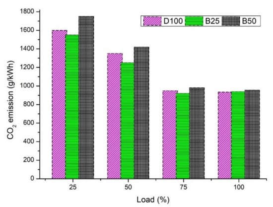 CO2 emissions were higher in the biodiesel blends, especially in B50 (Figure 13). Early combustion and blend ratio play an important role, and these parameters are interrelated. Moreover, the addition of Carbon Nanotubes to the fuel mix increases the CO2 emissions. The CO2 emission rate of B25 and B50 was 940 g/kWh and 980 g/kWh, respectively [59,60]. The net increment in CO2 emissions in the fuel blend B25 was around 3% compared to neat diesel.