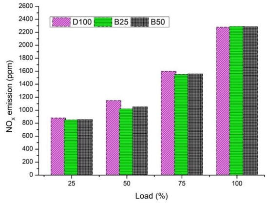 The nitrous oxide emission variation based on different load conditions for algae-based biodiesel blends is depicted in Figure 14. The linear increment in emissions of nitrous oxide is clearly seen in Figure 14 for all the blends. Oxygen content and combustion temperature in the combustion product determines the nitrous oxide formation. In general, increments in load conditions leads to linear increases in NOx emissions, resulting in an increase of the average gas temperature and fuel to air ratio. Algae-based biodiesel showed lower nitrous oxide emissions and high heat release rates. Shorter combustion duration reduces the biodiesel blends’ NOx emissions. In addition, the shorter duration available to form nitrous oxide from nitrogen reduces the NOx emissions. This process decreases the gas temperature, which ultimately reduces NOx emissions. From Figure 14, it is evident that biodiesel blends showed lower NOx emissions from 25% to 100% load conditions. The B25 blend showed more than 100% reduction in NOx emissions compared to conventional fuel. The reason behind the lower NOx emissions is that biodiesel fuel has improper spray properties, due to an increase in density and viscosity, along with improper combustion.