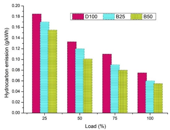 The unburned HC emissions of biofuel were lower than for diesel (Figure 15). The higher amount of oxygen present in the biofuels improves the combustion process, thus decreasing the HC emissions [61]. The HC emissions are directly opposite to the NOx emissions. As the HC emissions decrease, the NO and NOx emissions increase [62,63]. The amount of NOx emissions was 0.058 g/kWh, 0.057 g/kWh, and 0.038 g/kWh for D100, B25, and B50, respectively.