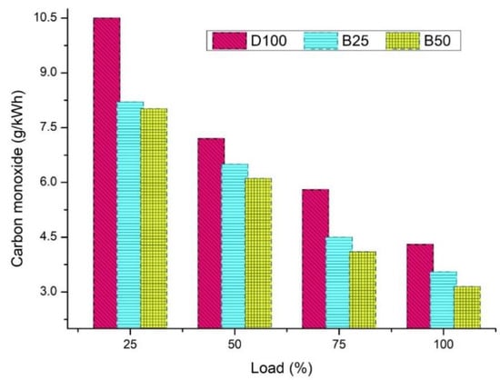 Owing to the complete combustion of biofuels, the emission rate of CO is lower in all biofuels (Figure 16). The rate of CO emissions for the D100, B25, and B50 was 3.56 g/kWh, 3.43 g/kWh, and 2.92 g/kWh, respectively, at CR17.5 and at full load conditions [31,39]. The reduced CO rate for B25 was about 2.8%, which is comparatively lower than diesel.