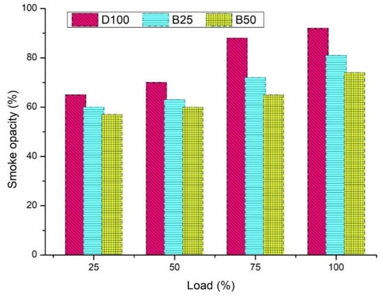 The smoke emission rate of biofuels is lower than diesel (Figure 17). The higher amount of oxygen present in the CNT-added spirulina microalgae biofuel helps achieve the complete burning of the fuel, which results in reduced smoke [64]. The quality air-fuel mixture also plays an important role in the emission of smoke. Rather than increased load resulting in increased smoke emissions, the increased blend ratio reduced the smoke emissions. The smoke emission for D100 at full load condition was 12.35%, while the smoke emission of B25 was 3.5%. This proves the positive properties of the B25 and B50 biofuels.