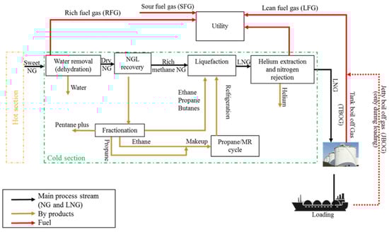 The LNG plant considered in this study is comprised of the following interdependent segments (see Figure 2): the LNG main process and exporting terminal (the LNG storage and loading). However, the shipping and receiving terminals (unloading and regasification) parts of the LNG chain are beyond the scope of this study. The main LNG process can be further divided into two sub-sections based on the energy demand of the processes; the hot section, which requires energy in the form of heat to remove impurities from the NG, and the cold section, which requires energy in form of work to drive the refrigeration compressors.