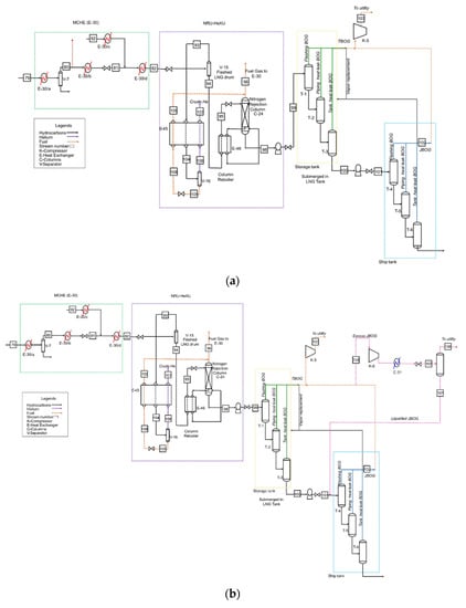 Figure 3b highlights the scheme for JBOG liquefaction. The fuel was balanced through the system, as discussed in Section 3.2. First, excess JBOG is compressed to 50 bar using a simple gas turbine cycle with an efficiency of 30% (K-6). The compressed BOG is then sent to a standalone liquefaction facility with a refrigeration cycle efficiency of 40%, as represented by a simple heat exchanger (E-31). The liquefaction temperature was manipulated using the Aspen Plus® Design Specs option to achieve the partial condensation of the JBOG such that the LHV of the vapor phase stream (106) is equivalent to fuel needed by the BOG compression and liquefaction without leaving excess fuel. The liquefied BOG was sent to the ship tanks as excess LNG.