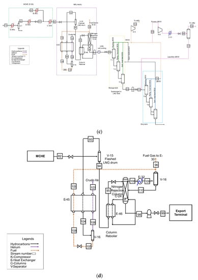 Figure 3a exemplifies the base case simulation configuration. The scrub column overhead from the NGL recovery unit (79) at −37.3 °C and 54.8 bar with a flow rate of 4.65 MMTA was taken as the starting point for the simulation. To simply the simulation, the cooling steps in the MCHE are represented by a series of simple heat exchangers (E-30/a, b, c, d) to mimic the C3MR cycle. This allows for a change of conditions and configuration to obtain the study objective. The model was designed to maintain the LNG and other side-product specifications to match the rigorous simulation results. Herein, the NG first cooled to −54 °C before entrance into the flash drum (V-7). The bottom streams were used as an NGL column reflux by Katebah, 2020 []. However, while the gas stream re-enters into the MCHE, it mixes with the LNG when it exits the fractionation unit and becomes cooled to a final temperature of −144 °C before it is introduced to the NRU–HeXU treatment process to meet the LNG specifications.