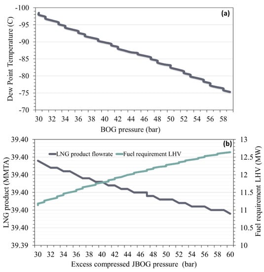 Effect of JBOG compression before liquefaction, (a) variation of BOG dew point temperature, (b) effect on LNG product and fuel requirement.