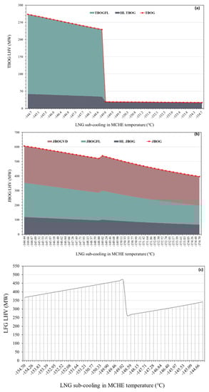 Effect of MCHE sub-cooling temperature on (a) TBOG LHV, (b) JBOG LHV, and (c) LFG LHV.