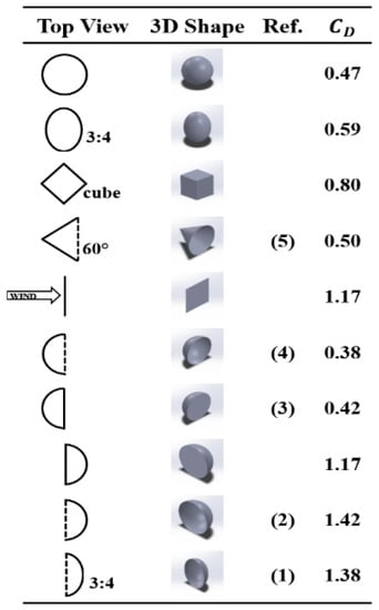 - Hoerner, S.F. The table of various shapes’ drag coefficients. In Fluid Dynamic Drag; 1965; pp. 3–17. Available online: http://ftp.demec.ufpr.br/disciplinas/TM240/Marchi/Bibliografia/Hoerner.pdf (accessed on 10 June 2021).