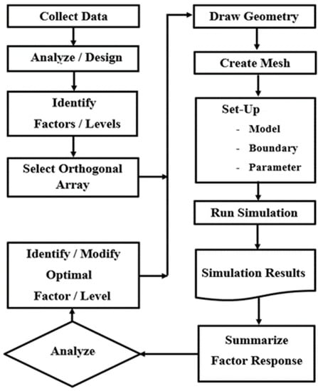 For easy referencing, the modeling process flows for both the Taguchi Methods and the ANSYS-Fluent are illustrated step by step in Figure 2, the Diagram of Modeling Process Flow.