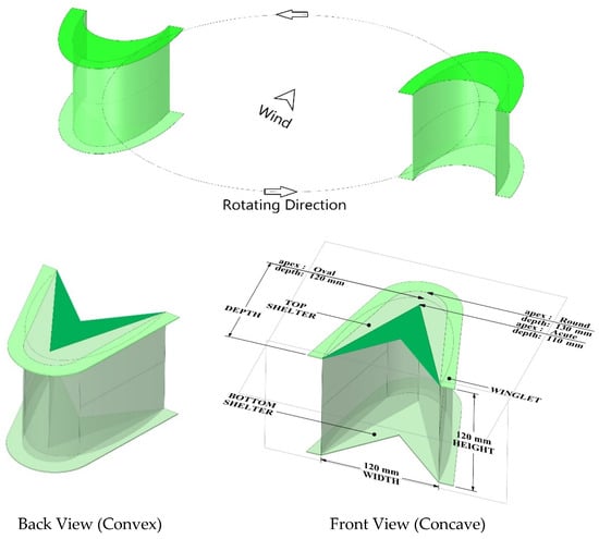 Based on the conceptual design and understanding, the dimensions and geometries of the novel blade model are as follows: on the concave profile, the setting of the reference area is 120 mm width and 120 mm height, then curve inward 110, 120, and 130 mm in depth. On the convex profile, the apex contours are designed in the acute angle and oval shape and are rounded in three different contours. At the top and bottom shelters of the blade, winglets with 5, 10, and 15 mm in width are spread to the outside blade edge, then covered with 1/3, 2/3, and full-size shelter to the inside blade edge. For easy referencing, the conceptual dimensions and geometries of the Novel Blade profile are illustrated in Figure 3 below, which includes three diagrams of rotating direction as well as front- and back-view diagrams as the concave and convex contours, respectively.