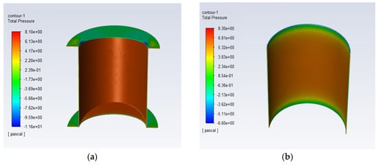 Table 10 shows that on the convex profile, the Novel Blade lift coefficient (0.1298) is much higher than the Savonius-type (0.0354), and the drag coefficient is about the same, 0.1128 vs. 0.1115, respectively. As to the drag coefficient on the concave profile, the Novel Blade shows some improvement over the Savonius type: 0.2361 vs. 0.2293, respectively. The total drag/lift coefficient for the positive work is the sum of concave Cd, the convex Cl, and the convex Cd, for which the Novel Blade value is 0.2531 and the Savonius type value is 0.1532. The total drag force is the sum of both sides’ drag coefficients, and the lift force is the lift coefficient on the convex contour only, as there is no lift coefficient on the concave profile. The total drag coefficient for the Novel Blade and the Savonius type is 0.1233 and 0.1178, respectively.