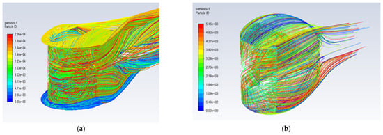 For visual comparison of the above numerical simulation and comparison, the pressure distribution diagram confirms that the pressure force on the concave contour of the Novel Blade is greater than on the Savonius type, about 6.13 vs. 5.32 (pascal), respectively, as illustrated in Figure 6. This means that the Novel Blade will produce more drag force. The diagram of streamlines flew over the convex contour, indicating that the flow lines on the Novel Blade are much longer and denser than the Savonius-type, as illustrated in Figure 7. This means that the novel blade will create more lift force.