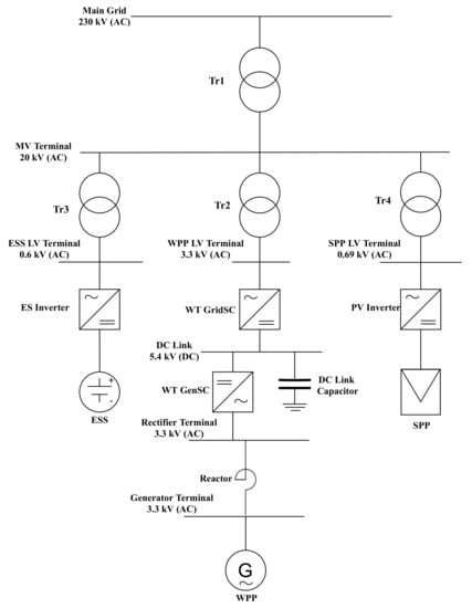 A model representation of the co-located HWPP is presented in Figure 1. The HWPP is connected to the grid using a 176 MVA 230/20 kV transformer. Medium voltage 20 kV terminal is used as PCC, where separate power plants—a WPP, a SPP and an ESS are connected. All the modeling and control for the HWPP has been done using power system analysis tool DIgSILENT PowerFactory [17].