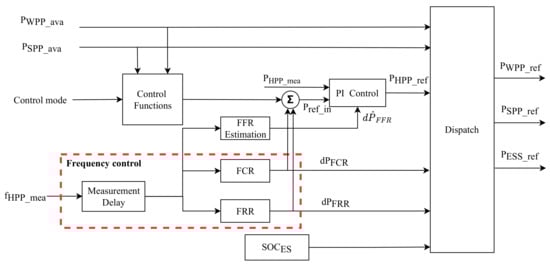 An HWPP level controller is mainly responsible for controlling and managing individual power plants, and a simplified block diagram is provided in Figure 2. A total available power of the HWPP (neglecting ESS) is the sum of the available power of SPP and WPP, which are calculated using their MPPT blocks. Control functions block takes available power signals together with the control mode from system operators (0, 1 or 2 representing no limitation, delta or balance control accordingly) [18] and adjusts power reference to the HWPP. The marked red area in Figure 2 represents the frequency controller of the HWPP. The FCR block has been implemented and it consists of both droop and ROCOF controllers. The FRR block is built for the implementation of frequency restoration reserve provision. Both of these frequency controllers generate power adjustment signals and . These signals are summed up with initial power reference to generate power reference input to the PI controller, which gives the final power reference of the HWPP to the dispatch block. It should be remarked that, frequency controller for the SC integrated in the WT is implemented in the asset level other than the HWPP control level, therefore being suitable for scenarios with or without the HWPP control. However, to coordinate with FCR and FRR in the HWPP control, the FFR response needs to be estimated and added as a compensation signal to the PI control at the HWPP control level. Such a scheme ensures that the counteraction between the asset level and the HWPP control level is avoided. Furthermore, for simplicity, FCR and FRR control have been disabled in this paper when evaluating the performance of a newly implemented FFR.