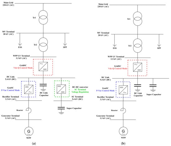 The model, where an SC has been added to the DC link of a WT in order to provide droop based FFR response, is shown in Figure 3. It is important to highlight that in such a configuration, the DC link is similar to a DC bus, where more than one power source is connected (WT and SC). SCs can be connected to the DC link via a DC-DC converter (Figure 3a) or directly connected to the DC link without converters (Figure 3b). The use of the DC-DC converter allows flexible control of SC with a wider range of voltage levels, but increases the capital costs due to the addition of the converters. On the other hand, the direct connection of SC requires lower cost, but the SC has to be of larger size to provide the required frequency support with the limited allowable voltage deviation at the DC link.