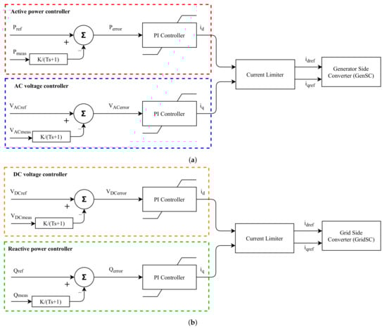 The control diagram for WT generator side converter is presented in Figure 4a. The generator side converter works in P-Vac mode and is responsible for the control of active power flow from the WT to the DC link, as well as the regulation of the rectifier terminal voltage. P controller receives a power reference signal from the HWPP controller and compares it with power measurement in the rectifier terminal. Errors between the signals are fed into a PI controller, whose output is the d-axis current reference . The voltage control of the generator is realised in a similar manner. The output of the voltage controller is the q-axis current reference . Both power and voltage measurements as control feedback are passed through a low pass filter to eliminate high frequency noises. Finally, both d-axis and q-axis current reference signals go through a current limiter block, which assures that the converter is not forced to work above its nominal power, and then are sent to the converter with a built-in inner current controller.