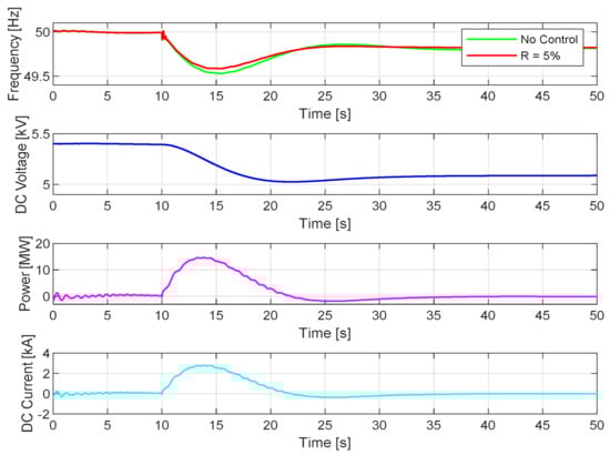 where —voltage reference of the SC [kV], —SC nominal voltage [kV], —corrective voltage signal [kV], —measured DC voltage [kV]. In this case, the controlled side is the SC terminal, while uncontrolled side is the DC link. In the steady state, when frequency is at nominal value (), voltage at the terminal of SC is constant and equal to the nominal DC link voltage. However, when frequency deviates from the nominal value, is regulated as described in Figure 5b, using a similar approach to droop control. It should be mentioned that as the SC power output depends on the derivative of the voltage (rate of change of voltage), the final frequency response seen from the grid is similar to inertia response. This means that SC power output eventually depends on the ROCOF. When frequency reaches steady state, regardless of what the steady-state value is, the power output from the SC will be equal to 0.